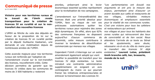 Victoire pour nos territoires ruraux et le travail de l’Umih : vote transpartisan pour la création de licences IV en ruralité et sur le non-transfert des nouvelles licences